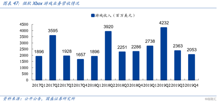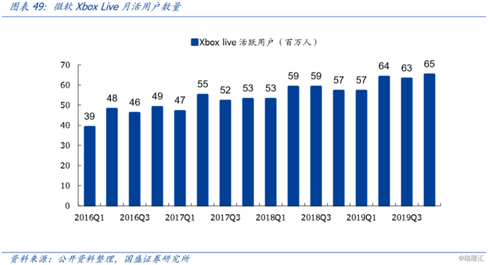 Xbox生态良好,近年来月活用户稳健提升。根据微软公布的数据,Xbox Live月活用户从FY2016Q1的3900万人,上升到FY2019Q4的6500万人,活跃用户得到了长足的发展,微软拥有庞大的游戏用户群体和成熟的商业模式。