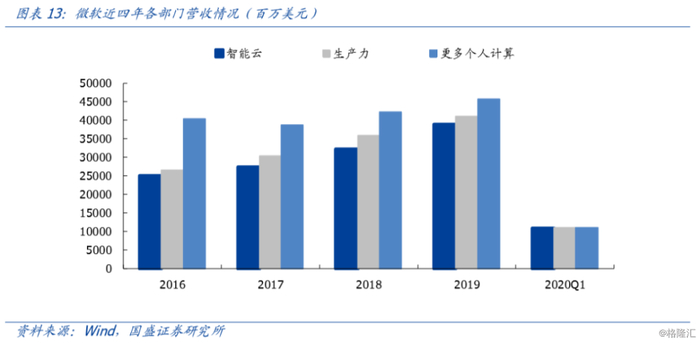 云相关业务营收提升明显。在2016财年,以Windows为核心的更多个人计算业务实现营收404.6亿美元,大幅领先其他两个业务板块。而在此之后,伴随着公司以云为核心的发展战略,以Azure为核心的智能云业务以及以Office365为核心的生产力业务发展迅速,2019财年三个部门之间的营收差距已经明显缩小。智能云板块和生产力板已经成为公司的核心驱动部门。