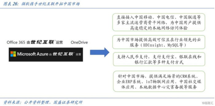 携手世纪互联登陆中国,是中国第一个合法合规的国际公有云。公司在2014年携手世纪互联推出中国版Azure,并为中国的企业级用户提供了中国版的OneDrive服务。微软智能云Azure在中国已服务超过11万家企业用户,用户满意度高达95%。随着中国数字化转型的不断深入,微软在华的各项投入也在不断加码,目前已在中国有4个高等级数据中心,为中国用户提供优质可靠的云服务。