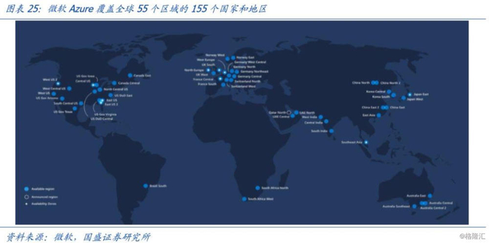 微软Azure覆盖区域居全球首位。对于云厂商来说,IaaS服务需要投入大量的资本建设云基础设施,并在相应的服务地区建设相关的云基础设施。目前微软在全球范围内IDC 覆盖区域居全球首位,Azure总共覆盖全球55个区域的155个国家和地区,光纤总长超70000英里,建立了世界上最紧密的商业云网络,在全球范围内为不同领域的客户带来超100种虚拟配置及品类充裕的存储和容器服务。