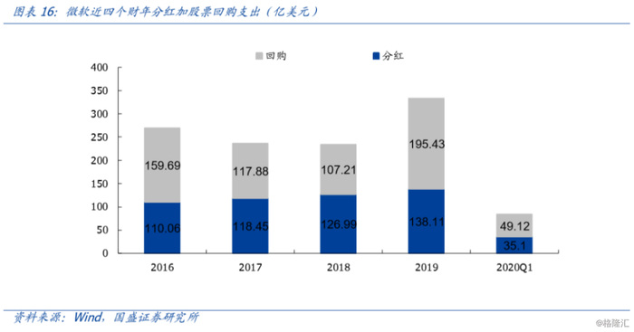 持续分红加股票回购,公司基本面稳健管理层对公司信心十足。公司近四年累计分红494亿美元,并累计回购价值581亿美元的股票,向股东释放了高达1074亿美元的回馈。持续的股票回购和分红一方面体现公司管理层对公司前景的看好,另一方面能够为股东带来长期的高额现金回报,体现公司基本面的稳健。