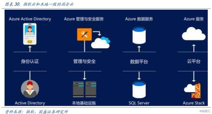 微软混合云优势显著,Azure Stack架构一致性大幅提升用户体验。微软于2014年起开始布局混合云市场,与思科、Dell等五家厂商合作研发Azure Stack,对比亚马逊、谷歌等公有云厂商,微软在混合云市场先发优势显著。Azure Stack混合云解决方案是Azure公有云在本地数据中心的延伸扩展,使用相同的Azure Resource Manager应用部署模式、自助服务门户和API,提供与Azure公有云一致的混合云平台和体验,将公有云的敏捷性和快速创新带到了本地环境,企业用户可以跨越混合云环境打造现代化应用程序,灵活性和控制力之间获得最佳平衡。