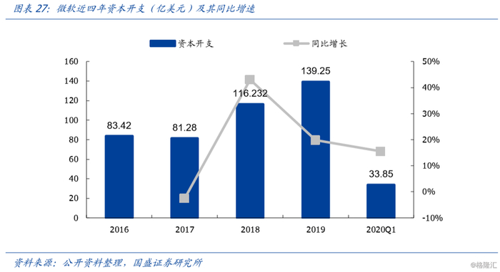 资本支出有所提升,巩固扩大IaaS市场地位。IaaS属于重资本业务,要在为用户提供服务的地区投建云基础设施,微软近年来资本支出有所提升,2019财年资本支出达到140亿美元,领先竞争对手亚马逊。公司经营情况良好,现金流丰富,能够支撑起云基础设施的资本支出,有利于公司进一步扩大IaaS市场份额。