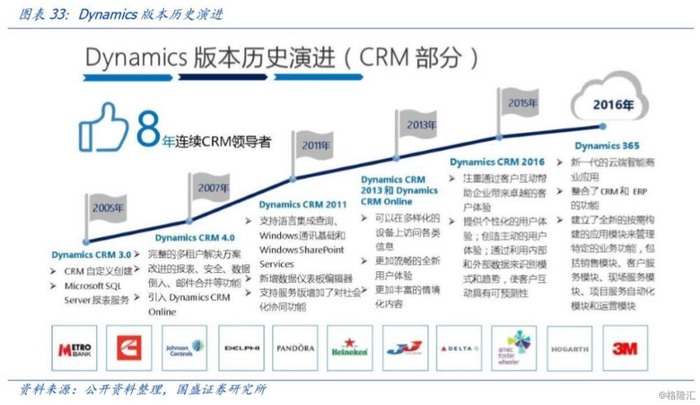 除Office365外,Dynamics365是公司另一重量级SaaS服务产品。Dynamics 365充分整合了CRM和ERP的功能,以按需构建的应用模块管理不同业务(包括销售,客服,现场服务,市场营销,财务和人力资源管理等模块),助力企业在各个细微之处完成数字化升级。Dynamics365充分融合了AI、MR、大数据、BI等技术资源,且与微软其他SaaS服务如Office 365、LinkedIn等进行无缝连接,打通不同产品间的数据壁垒,为客户提供极致体验。目前世界500强企业中70%均使用Dynamics365,再次印证微软toB端强大的实力和极高的客户认可度。