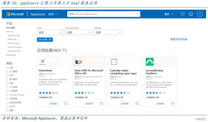 优质的生态吸引大量开发者,AppSource汇聚上万SaaS服务应用。目前AppSource共平台上提供2760个Office 365应用、2031个Dynamics 365应用、4611个Web应用及713个Power BI App,其中绝大部分应用都来自第三方开发者开发的软件,微软通过开放和开源吸引了越来越多的开发者加入,在其生态上开发多种多样的垂直领域的软件,极大地丰富了应用的可选择性,赋予了产品更强的生命力,也让用户有更多的选择、能够更方便的选择合适的应用解决问题,一个良好的开放的生态体系能够让微软、第三方以及用户实现共赢。