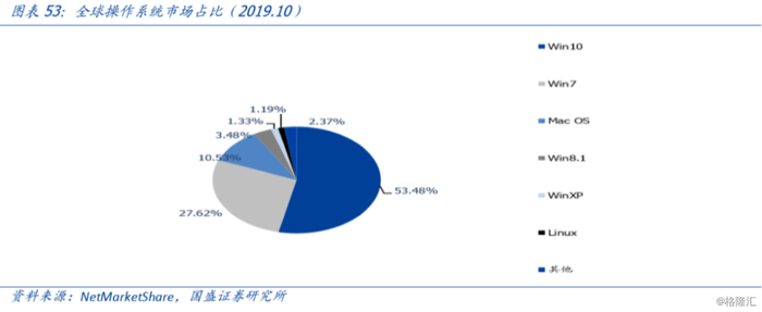 Windows操作系统在全球范围内是最主流的操作系统。根据微软最新公布的数字,全球运行Windows10操作系统的超过10亿台。根据NetMarketShare最新的数据显示,全球范围内Windows10系统的市场占有率达到53.48%,整个Windows系统的市场占有率为89.39%,继续统治着桌面级操作系统这一领域。而随着微软在2020年1月停止对Windows7系统的更新支持,预计将会有更多的用户转向Windows10系统,带动微软Windows业务的增长。