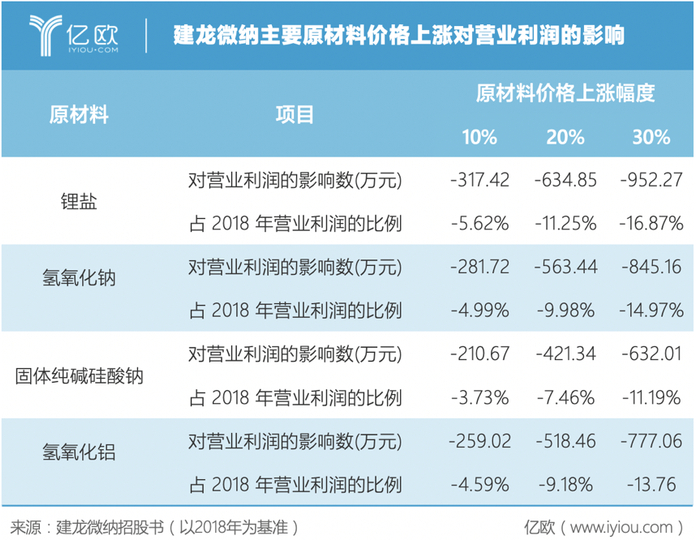 作为一家生产型企业,公司在生产经营过程中必然会消耗大量能源。建龙微纳产品主要原材料是锂盐、氢氧化钠、固体纯碱硅酸钠和氢氧化铝。根据招股书,分子筛产品对原材料依赖度非常之高,这四种原材料占公司主营业务成本比例分别为45.61%、51.64%、52.46%、51.94%,占直接材料比例分别为85.37%、80.55%、82.74%和75.06%。