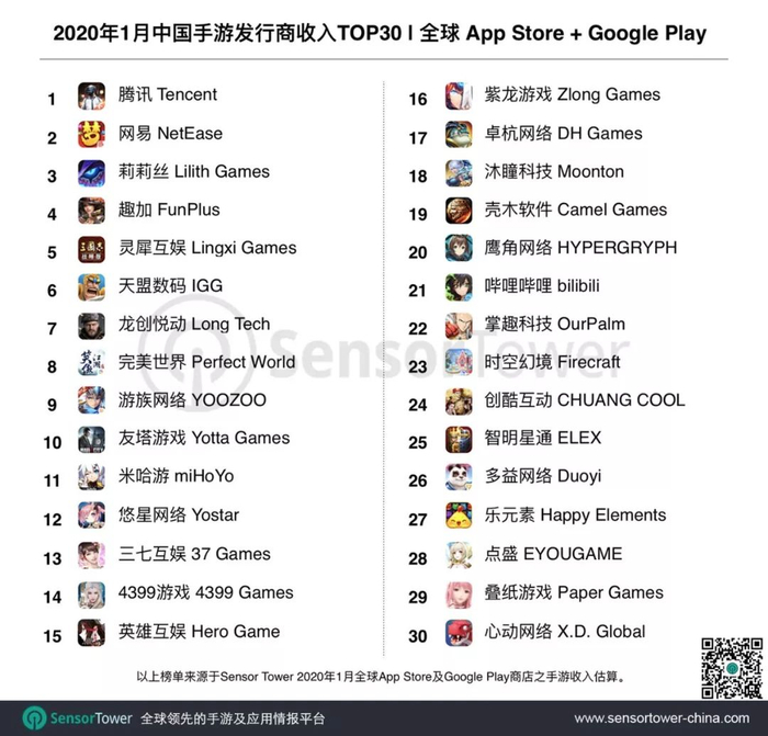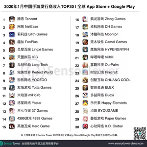 Sensor Tower 商店情报平台显示,2020年1月中国手游发行商在全球 App Store 和 Google Play 的收入排名。榜单中30个手游发行商1月全球吸金超过15.6亿美元,占当期全球手游总收入28.2%。详细榜单变化如下。