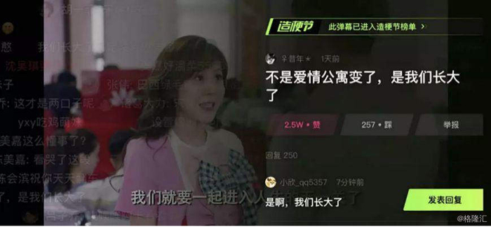 去年爱奇艺借助AI舆情监测技术推出了“梗”弹幕玩法,点赞数多的弹幕被选为“梗”弹幕,随后“梗”弹幕也顺势在其他社交媒体上进行快速传播。此次在线上,爱奇艺通过弹幕“造梗”节吸引了大量观众参与,《爱情公寓5》上线后也是刷新了梗弹幕点赞数的纪录——排名第一的梗弹幕的点赞数高达2.5万+。