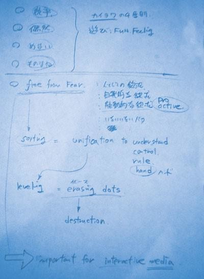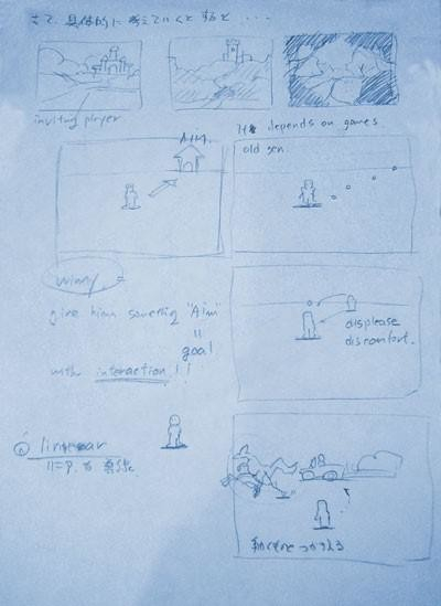 安原弘和:所以我给程序员想出一些主意,他们根据计划或者编程难度来决定哪些是好的、哪些是可以采用的。这些想法都是为某个部分设计的,所以我做出一张图片或者设计图形的扫描,加入一些简单的元素,随后做一个给美术师和程序员们的文档。