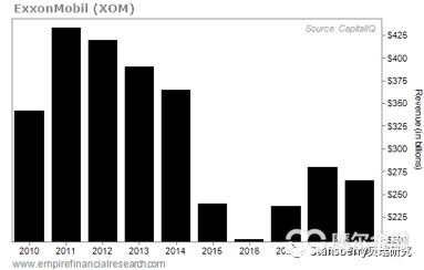 长话短说,首先让我们来看看ExxonMobil公司近10年来的营收数据情况,单位十亿美元。