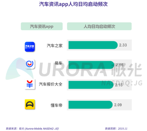 根据极光的统计结果,汽车之家的人均日均启动频次最高,达2.33次。主要汽车资讯app人均日启动频次超2次,其中易车人均日启动频次为2.16次,排名第二。
