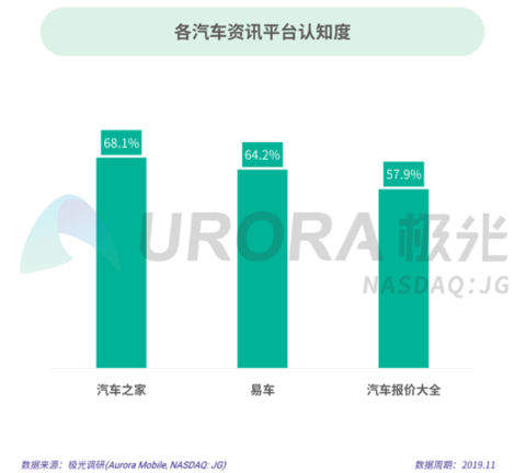 根据极光的统计结果,在汽车资讯行业用户中,汽车之家的认知度近七成,达68.1%居于行业首位;易车系的易车与汽车报价大全的用户认知度分别达64.2%和57.9%。