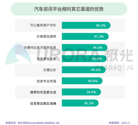 根据极光的统计结果,“可以看到用户评价”是汽车资讯平台的主要优势。同时,相对其他渠道,汽车资讯平台在评价反馈、价格显示和信息对比方面的特点较受用户喜爱。