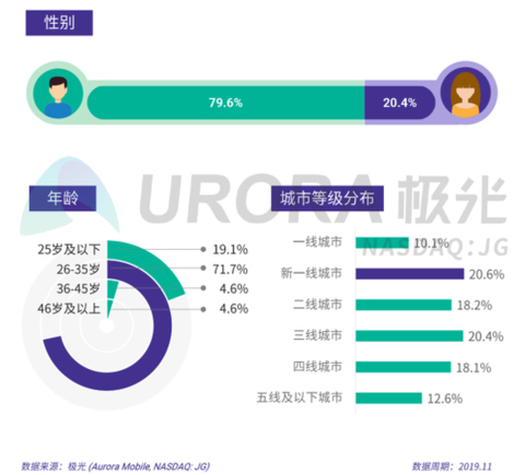 根据极光的统计结果,汽车资讯行业用户特征明显,男性用户占比近8成,年龄段集中在26-35岁。同时,城市等级分布较为分散,一二线城市与下沉市场各占一半。