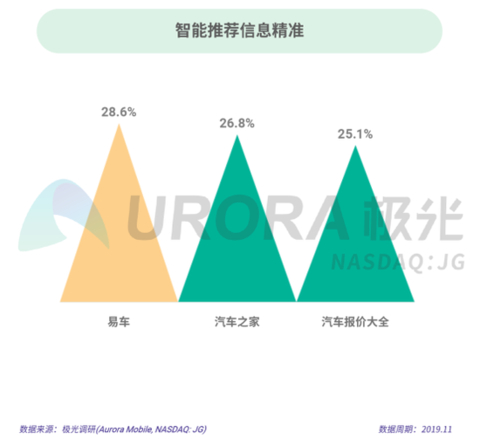 根据极光的统计结果,28.6%的用户认为易车智能推荐信息精准,其次是汽车之家和汽车报价大全。