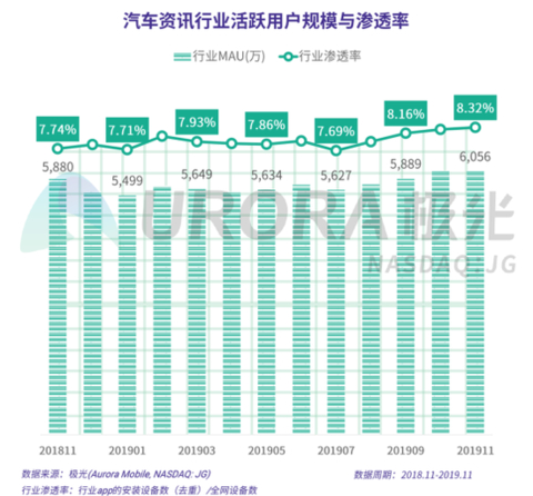 极光的统计结果显示,汽车资讯行业渗透率今年上半年比较稳定,下半年有所增长,2019年11月达8.32%,行业MAU在下半年也有所增长,11月超过6千万。