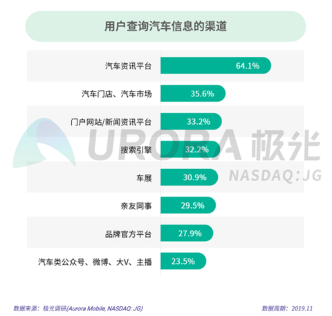 根据极光的统计结果,64.1%的用户在查询汽车信息时选择汽车资讯平台,其次是汽车门店、汽车市场。同时,选择从汽车类公众号、微博等平台获取汽车资讯的人占比最少。