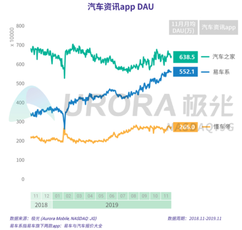 根据极光的统计结果,易车系app 11月月均DAU达552.1万,近一年DAU增长显著,是汽车资讯行业最具增长力的平台。