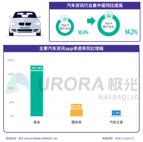 根据极光的统计结果,易车在过去一年增幅明显,渗透率同比增长1.6倍;同时,汽车资讯行业集中度非常高,且在易车增长的带动下,汽车资讯行业集中度同比上升明显,top 4 app现已占据行业用户数量的94.2%。