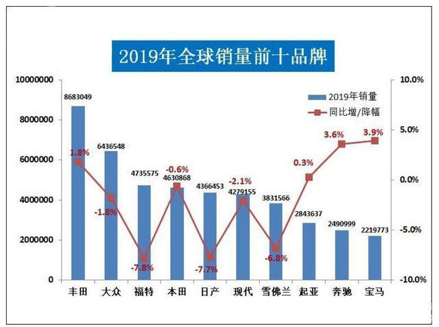 2019全球汽车销量前十品牌出炉,奔驰、宝马增幅最高!