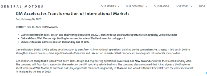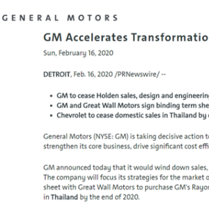 【环球网 记者 陈梦茵】美国当地时间2月16日,通用汽车在官网上发布公告称,公司将于2021年前,逐步结束在澳大利亚、新西兰两国的销售、设计、工程研发等运营工作,并退出霍顿品牌(Holden)。