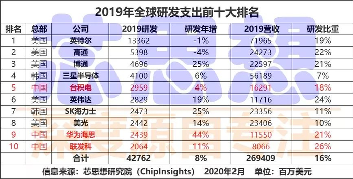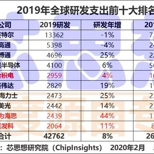 原标题:2019年半导体研发投入增长,20家公司过10亿美元 来源:芯思想