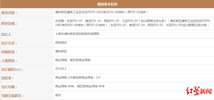 该地块信息显示,地块的出让方式为“招挂复合”,地块土地用途为商业用地、餐饮旅馆业用地,出让面积共47319.2平方米。该项目位于上海浦东新区张江科学城的康桥工业区,离上海迪士尼仅一站地铁。