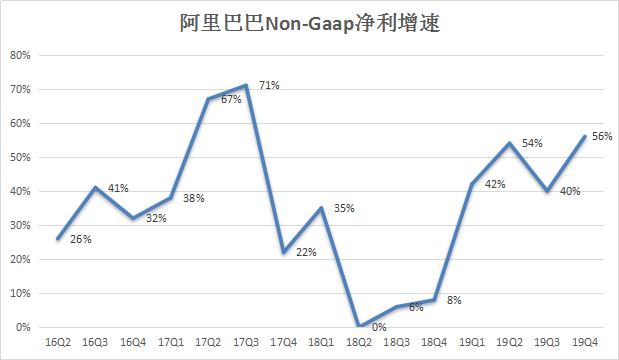 同样不负所望,Q4财报全面超越市场预期。38%营收的增长,56%的Non-GAAP净利润增长,大超预期,尤其值得关注的是,淘宝直播正在作为新的购物场景带动用户和GMV增长,截至2019年12月,观看淘宝直播的月活跃用户和淘宝直播带动的GMV,都同比增长超过一倍。此外,云计算收入首次突破100亿元,增长速度保持60%以上。