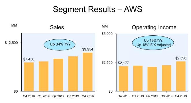 2019年,AWS陆续推出约77项新的产品、功能和服务,涉及通用计算芯片与AI推理芯片、计算基础设施、数据仓库、数据库及PaaS服务、AI与边缘计算等领域,这支撑了AWS 超30%营收增速。AWS本季度的销售额增长了25亿美元,超过大多数云计算公司收入的整体年度总额。