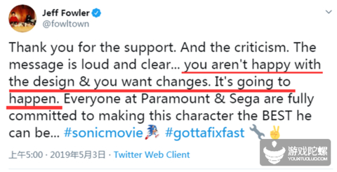 在全民讨伐下,该片导演Jeff Fowler被迫宣布重新制作索尼克形象。电影原本定于2019年11月上线也推迟到今年2月14日。