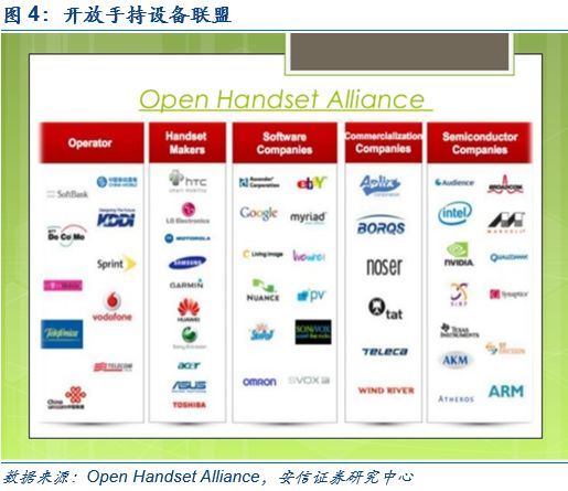 与多家硬件厂商合作,是国内手机厂商操作系统原型产品。Android项目在提出之时就保持了强开放性,谷歌2007年成立的开放手持设备联盟包括HTC、摩托罗拉、三星手机巨头厂商,Sprint、T-Mobile等无线运营商,以及高通、德州仪器等芯片厂商。2008年,华为也加入了该联盟。受制于谷歌服务的限制,国内手机厂商的操作系统本质上都是AOSP项目的变种,包括小米MiUI,华为EMUI等。