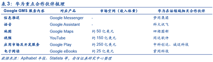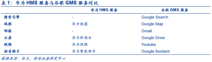 我们认为谷歌GMS服务可分为功能与配套应用两个层面。其中,功能是指GMS服务为移动终端配套打造的同步和推送两大业务,是手机类终端所必需的。配套应用是指GMS服务所附带的谷歌系全家桶App,主要包括谷歌搜索(Google Search)、谷歌地图(Google Map)、谷歌云盘(Google Drive)、谷歌邮件(Gmail)、谷歌商店(Google Play)、谷歌视频(Youtube)、谷歌相册(Google Photos)、谷歌视频聊天(Google Duo)等。