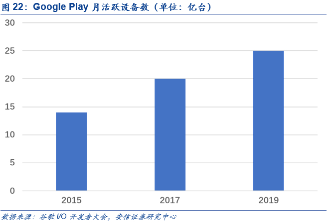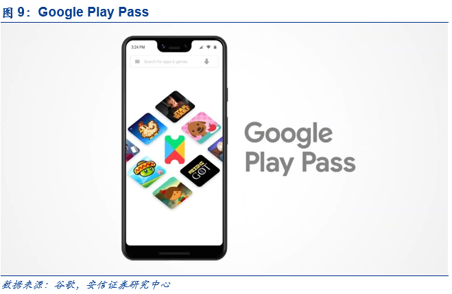 发布App数量持续增长,适时推出另类增值服务。受到Android商业模式的影响,更多App采用了免费形式对外发放。根据statista统计,2018年Google Play上的App总数超过300万,其中免费应用占比达到94.24%。同时,Google Play除作为管理工具协助GMS落地外,也积极拓展变现途径,包括在图书、音乐等领域电子商城的延伸。2019年9月23日,Google Play Pass在美国上线,该订阅服务允许用户畅玩指定的收费游戏和App,收费为每月4.99美元。