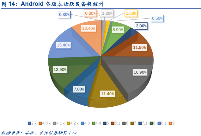 GMS帮助谷歌加强中央监管,是Android反碎片化有力工具。随着Android操作系统全球装机量的持续提升,Android碎片化问题变得日益严重。截止至2019年5月,仍有0.3%的手机终端在使用Android 2.0版本操作系统,而最新的Android 9.0版本使用量仅为10.4%。大量的Android版本持续使用,为谷歌公司维护和App软件开发商开发大幅增加了成本。谷歌通过推出GMS服务,并将部分Android功能转移其中,有利于加强公司管理,并通过云化更新实现无缝升级。