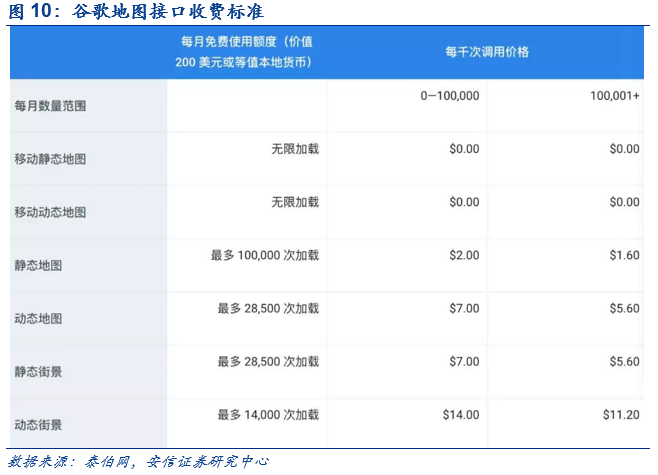 应用场景广泛,变现潜力巨大。随着4G时代高速网络的普及,地图业务的导航功能被更加广泛的使用,成为为各类餐饮、差旅导流的工具。Google Map曾在2018年进行过调整,宣布成立新平台,并调整地图接口服务的模式和价格,部分服务价格涨幅达14倍。Morgan Stanley曾进行过相关测算,认为Google Maps在2019年营收贡献将达到29.5亿美元,在2023年有望达到110亿美元,复合增速达到近40%。