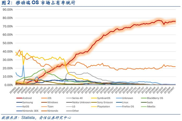 广受欢迎的移动端操作系统产品,全球装机量庞大。Android是谷歌著名的手机移动端操作系统项目,与谷歌各类服务深度集成,并始终坚持开源战略。谷歌始终在Android项目坚持第三方软件厂商立场,并与外部合作持开放态度,因而受到手机、平板等移动终端硬件厂商的广泛欢迎。根据谷歌官网数据,目前已有来自1300家厂商超过24000款手机及平板产品搭载了Android操作系统,其中包括华为、三星、索尼等知名厂商。自谷歌在2007年对Android项目开源并开启对外合作后,Android操作系统的移动端装机量持续攀升,在2010年超过传统手机巨头诺基亚的Symbian操作系统,甚至在2017年超过微软Windows成为全球第一大操作系统。