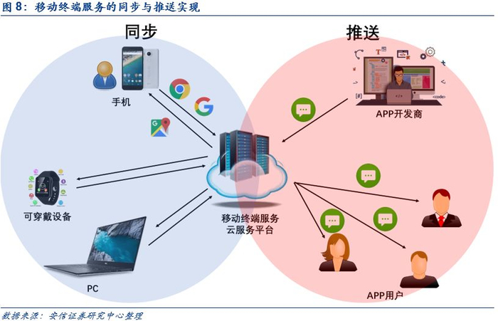 同步与推送是移动终端服务最重要的功能,均高度依赖于云计算。同步与推送是Android区别于AOSP开源项目的主要特征之一,即通过服务将“App-操作系统”、“App-设备”、“设备-设备”联系起来。其中,同步的实现本质上是通过用户设置及浏览数据以云服务器为中介,在不同设备间上传下载来实现的。推送的实现本质上是App厂商向GMS云服务器提交推送信息申请,并由云服务器向各手机终端用户发送信息。同步与推送两项功能的实现均需要依托于云平台,一个能够容纳所有用户的云平台是移动终端服务必须的。
