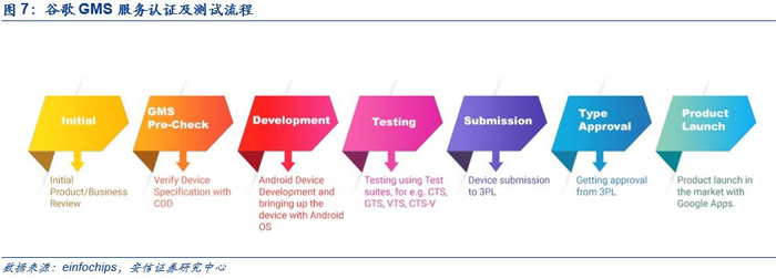 GMS服务需经授权方能在移动终端产品上搭载。GMS服务的设计初衷是效仿iOS的ANPS加强监管,结束Android操作系统定制化的乱象,因而本质上并非是一项自愿自由搭载的服务。任何移动终端厂商如果意向于通过合法途径搭载GMS服务,必须经过一系列谷歌公司测试,从而获得GMS服务授权流程。GMS服务授权流程包括以下主要部分: