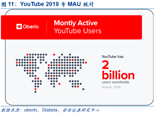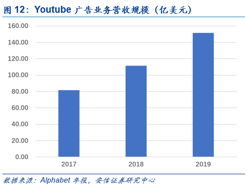 2019年MAU达20亿,为谷歌贡献超百亿美元广告营收。根据Statista统计数据,YouTube在2019年月活用户规模达到20亿。根据谷歌年报披露,YouTube在2015年已拥有15亿用户。谷歌在2019年年报中首次将YouTube带来的广告营收进行分拆披露,其在2017-2019的表现分别为81.5/111.6/151.5亿美元,约占据谷歌公司广告业务整体营收10%。