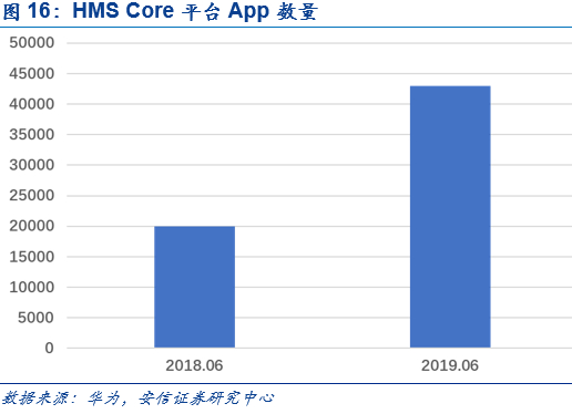 HMS Core是华为移动服务提供的端、云开放能力合集,从而实现跨设备、跨平台的一致性,并为平台App应用提供核心能力支持。HMS Core服务目前已迭代至HMS Core 4.0版本,月平均用户数由2018年6月4.2亿增长至2019年6月的5.3亿的规模,同期平台注册开发者由45万增长至91万。同时,融入HMS Core体系的App数量也由2万增长至4.3万。HMS Core目前已在全球170多个国家得到应用,并严格遵守GApp、GDPR等安全及隐私相关规范。