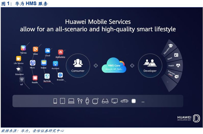 华为HMS服务是对标谷歌GMS服务的产品。华为HMS服务是附着于华为手机硬件终端及操作系统的软件服务产品,其主要参照对象是谷歌在Android操作系统上扩充的GMS服务。通过打造HMS服务,华为有望类比谷歌全家桶在商店、地图、视频等各领域开拓出新兴市场,更能够帮助各个国产软件合作伙伴打开新兴的海外市场,加速国产软件“出海”进程。