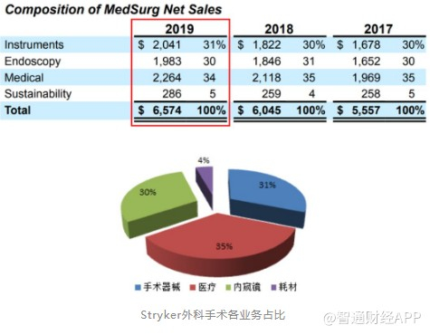 外科手术业务19年总营收为65.7亿美元,较2018年增长8.8%。外科手术业务增长平稳,其中手术器械占31%,内窥镜占30%,医疗仪器占34%,耗材占31%。19年营收额与18年相比,手术器械类业务增长率为12%,内窥镜业务增长7.5%,医疗仪器业务增长6.9%,耗材类业务增长率为10.4%。可以看出各项业务均有一定增长,近年Stryker来对于外科手术领域业务的研发与收购较为稳健,19年3月收购了总部位于以色列的骨科手术器械公司OrthoSpace;19年内窥镜产品还推出了下一代旗舰可视化技术1688高级成像模式平台,融入4K图像和ICG荧光技术,加上SPY-PHI便携式手持成像仪为微创和开放外科手术提供了一个标准化的系统,预期未来该业务将继续平稳增长。