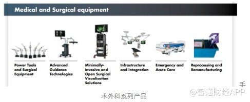 手术外科产品包括手术设备和导航系统(Instruments)、内窥镜和相关成像系统(Endoscopy)、患者处理、急诊医疗设备和重症监护一次性产品(medical)、再加工和再制造医疗设备(Sustainability)以及用于各种医疗专业的其他医疗设备产品。