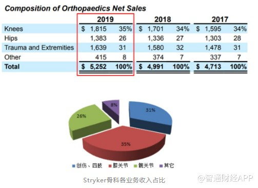 骨科业务19年总营收为52.5亿美元,较18年相比增长5.2%。在骨科部门内部,各业务营收分布均衡:膝关节类业务占35%;髋关节类业务占26%;创伤与四肢类业务占31%。各业务均衡发展,历年占比变化不大。其中膝关节类业务19年营收18.1亿美元,较18年的17亿美元增长6.7%;髋关节类业务19年营收13.8亿美元,较18年相比增长3.5%;创伤与四肢业务去年营收16.3亿美元,与18年相比增长3.7%。Stryker2019年大手笔收购的Wright Medical Group丰富了其肩关节系列产品,未来创伤与四肢业务或将有大幅增长。