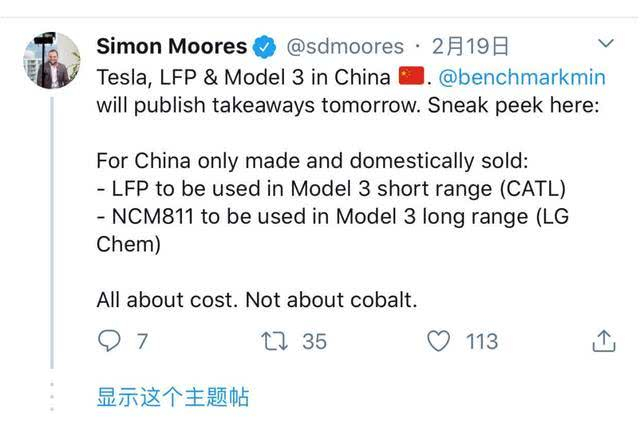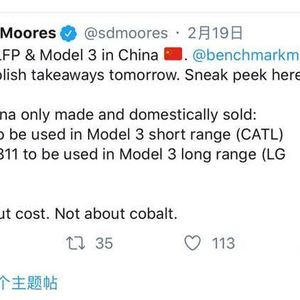 在特斯拉表示无钴不一定是LFP(磷酸铁锂)之前,英国研究机构BenchmarkMinerals有关人士19日通过社交媒体发布了中国Model 3使用CATL LFP的消息,并指出,这仅仅是针对中国市场的成本之举,跟“钴”的确无关——大家都知道特斯拉在研发三元无钴电池。该机构亦发表有关这件事的看法,称使用LFP电池亦不会影响Model 3在中国的新能源补贴,这是特斯拉中国市场战略的一部分。