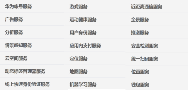 在华为的开发者网站上,我们能看到华为最新的HMS Core 4.0版的完整服务内容,如下图所示。