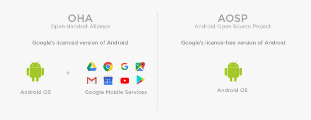 将安卓与GMS打包安装时候需要谷歌授权,相关手机终端属于OHA(开放手机联盟)管理,而如果一台手机只安装安卓操作系统,就不需要谷歌公司的授权,厂家只要按照安卓开源项目AOSP的要求,自行下载并使用源代码就可以了。中国内地市场销售的手机基本都属于后者。