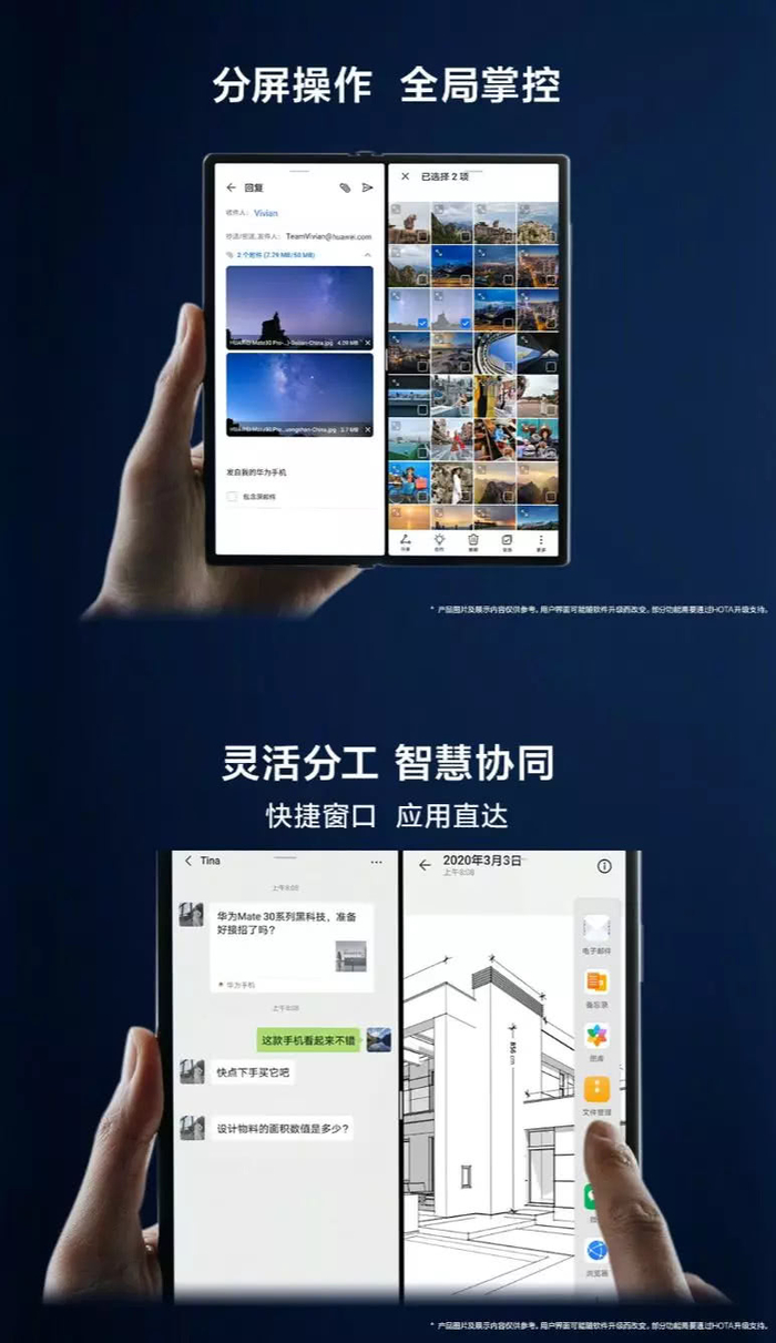 除了此前应用于Mate X的智慧分屏、平行视界等功能之外,Mate Xs还将拥有“多屏协同”功能——内容可在手机、平板、电脑之间自由拖拽、观看,并加入了侧边分屏快捷栏。这都意味着华为全系产品用户的交互自由时代来了。