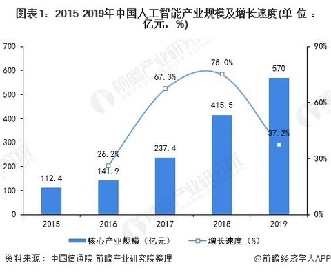 随着信息技术快速发展和互联网快速普及,以2006年深度学习模型的提出为标志,人工智能迎来第三次高速发展。同时,在政策和技术的推动下,我国人工智能核心产业规模不断扩大。根据中国信通院统计数据显示,2015年到2018年中国人工智能产业规模复合平均增长率为54.6%,高于全球平均水平(约36%)。2018年,中国人工智能产业市场规模已达到415.5亿元,2019年初步预测达到570亿元。
